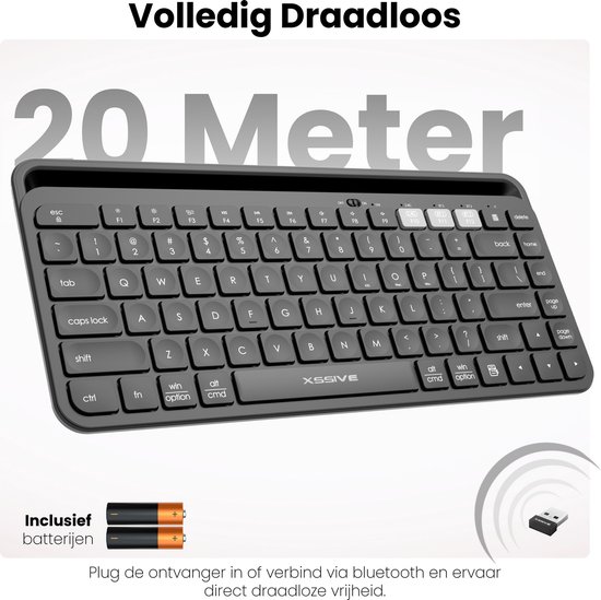 Je kan deze wireless keyboard verbinden met 3 apparaten tegelijk via Bluetooth 5.0, Bluetooth 3.0 en de 2.4 GHz dongle. Zo verbind je bijvoorbeeld je tablet en telefoon via de twee bluetooth kanalen, terwijl je de dongle gebruikt voor je laptop, computer of TV. Het toetsenbord werkt met 1 apparaat tegelijkertijd, je schakelt met 1 knop tussen je verbonden apparaten. Geen gedoe met opnieuw verbinden, gewoon direct verder typen waar je gebleven was.